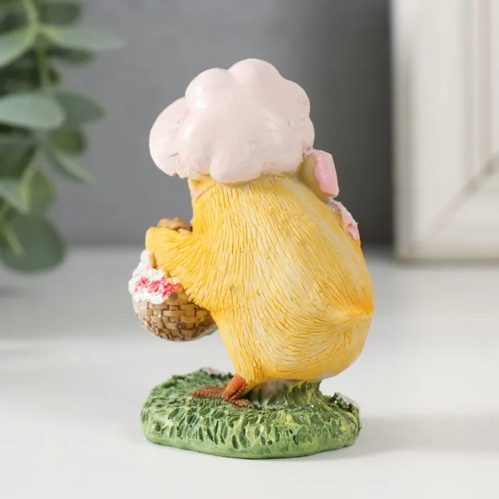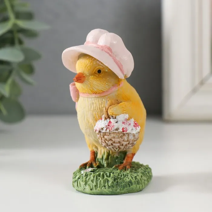 Представляем очаровательную фигурку, которая наполнит ваш дом атмосферой весеннего настроения и радости. Этот милый цыплёнок в шляпке с корзинкой цветов воплощает собой символ тепла и уюта, становясь не просто элементом декора, а источником позитивных эмоций. Компактные размеры — 6.5×4×8 см — делают её универсальным решением для украшения полок, столов или даже садовых уголков.