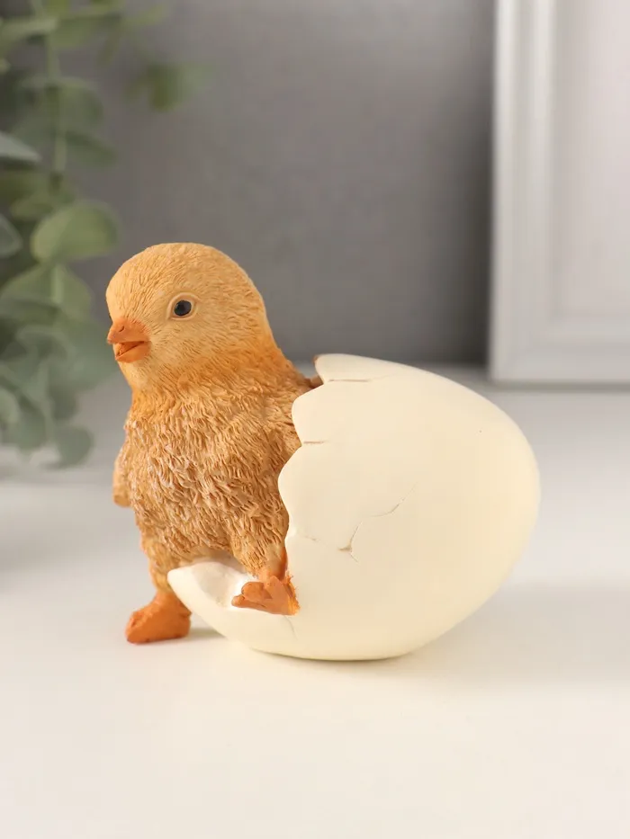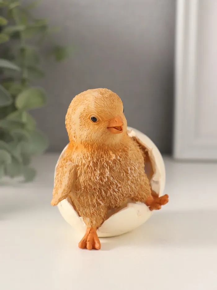 Позвольте себе улыбнуться, глядя на эту очаровательную фигурку, которая станет настоящим украшением вашего интерьера или трогательным подарком для близких. Маленький цыплёнок, выглядывающий из яичной скорлупки, выполнен с невероятной детализацией и теплотой, которые подчеркивают его уникальность.