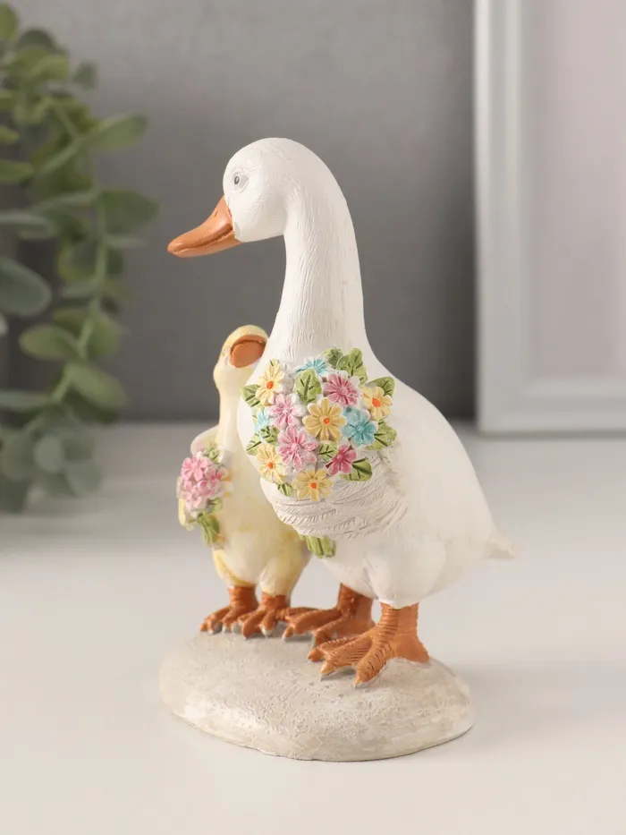 Представьте себе: в вашем доме расцветает маленькое чудо! Эта очаровательная фигурка, полная нежности и весеннего настроения, словно сошла со страниц доброй сказки. Мама-утка, окруженная заботой о своем милом утёнке, преподносит вам букеты свежих, красочных цветов. Кажется, они принесли с собой лучик солнца и хорошее настроение!