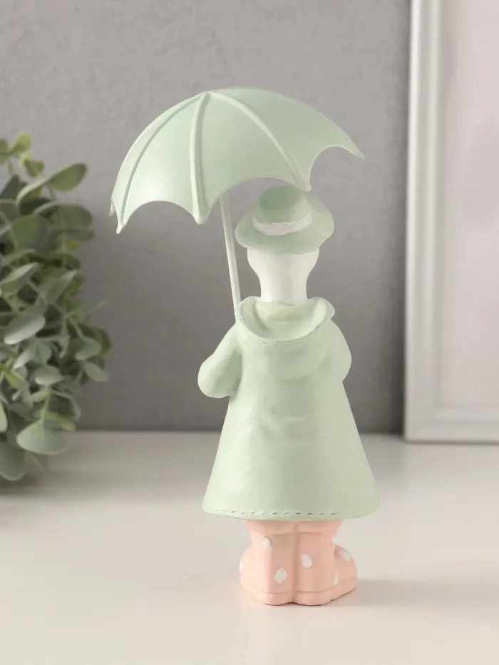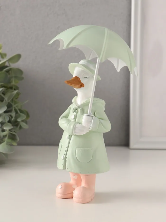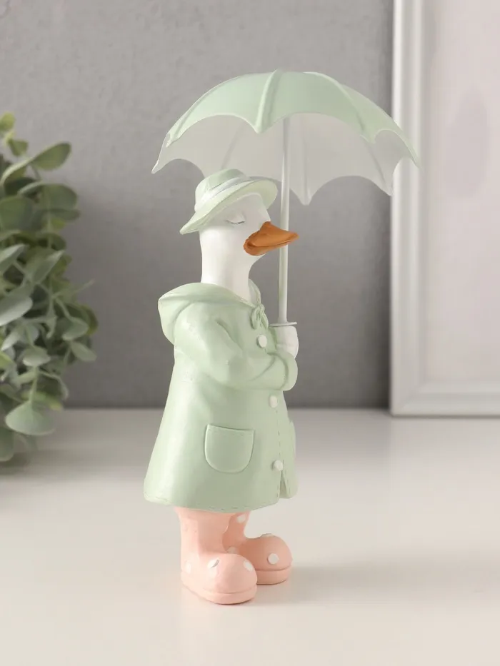 Очаровательная фигурка утки в зелёном дождевике под зонтом добавит изюминку в ваш интерьер. С высотой 15.5 см и размерами 7×6.5 см, она станет прекрасным акцентом на полке или столе, привнося атмосферу уюта и игривости.