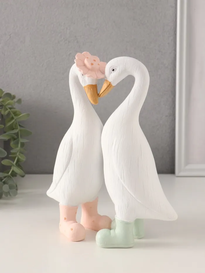 Фигурка изготовлена из высококачественного полистоуна, что делает её прочной и долговечной. Белый цвет и высота в 21,5 см позволяют разместить её на любой поверхности — от полок до подоконников. Утки в резиновых сапогах символизируют семейное единство и гармонию, создавая атмосферу комфорта и уюта.