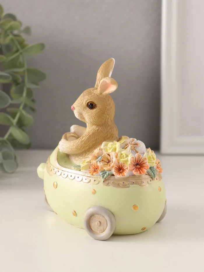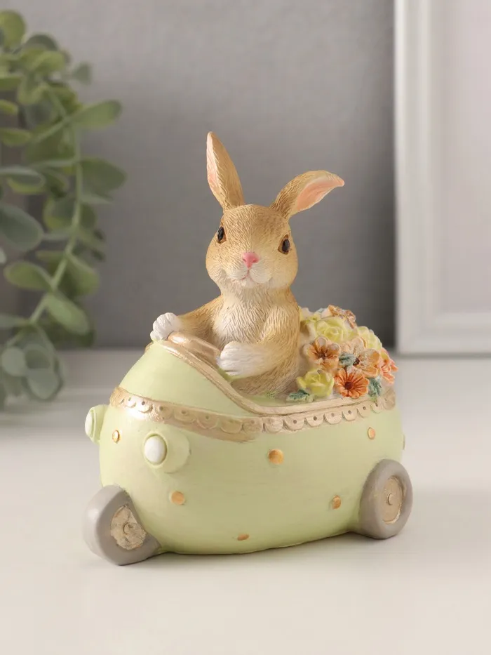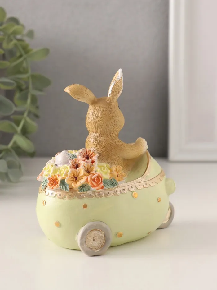 Изготовленная из полистоуна, фигурка отличается высокой прочностью и устойчивостью к повреждениям, что делает её идеальным выбором для многолетнего использования. Каждая деталь, от улыбчивой мордочки зайчика до аккуратных цветов в машинке, проработана с особым вниманием, подчеркивая мастерство и качество исполнения.