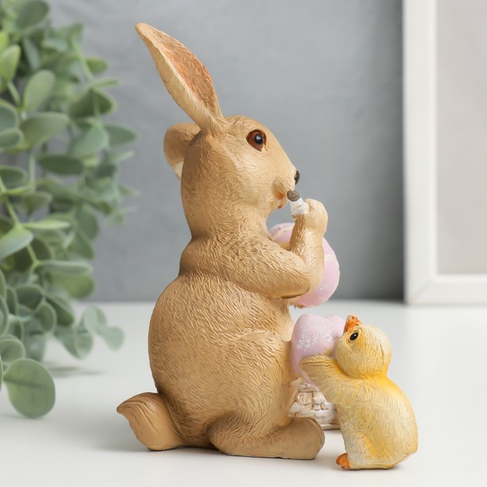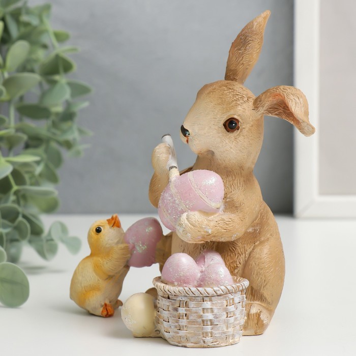 Эта фигурка из полистоуна, изображающая зайчика с утёнком, раскрашивающих яйца, станет очаровательным украшением вашего интерьера, добавляя ему нотку тепла и праздничного настроения. Её бежево-разноцветный дизайн и детализированная проработка фигур создают атмосферу уюта и радости, а компактные размеры (13×9×9,5 см) делают её идеальным акцентом для полок, столов или праздничных композиций.