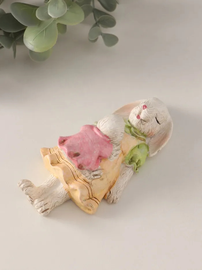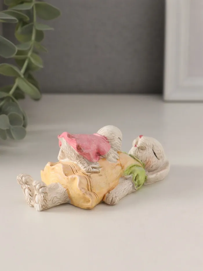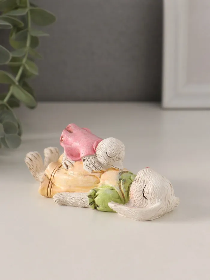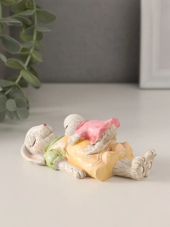 Очаровательный дуэт: фигурка представляет собой милого зайку и маленького цыплёнка, мирно спящих рядышком. Эта трогательная сцена передает атмосферу покоя и гармонии, идеально подходящую для спальни или детской комнаты.