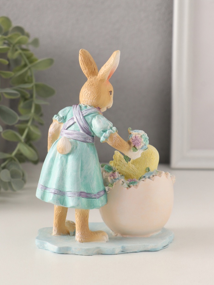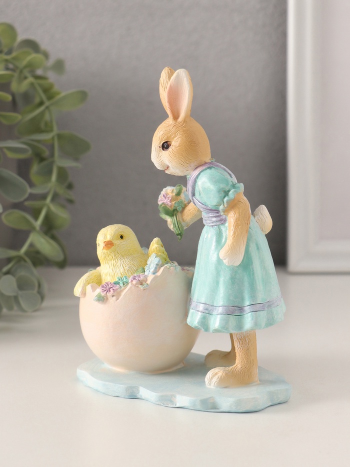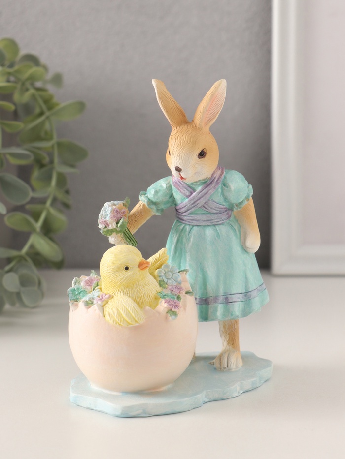 Представляем вашему вниманию изящное произведение декоративного искусства, способное привнести нотку тепла и уюта в любой интерьер. Эта очаровательная композиция включает в себя два трогательных персонажа: милого зайчика в голубом платье с нежными узорами и цыплёнка, спрятавшегося в яйце среди незабудок. Благодаря своему уникальному дизайну и высокому качеству исполнения, она станет идеальным дополнением как детской комнаты, так и гостиной.