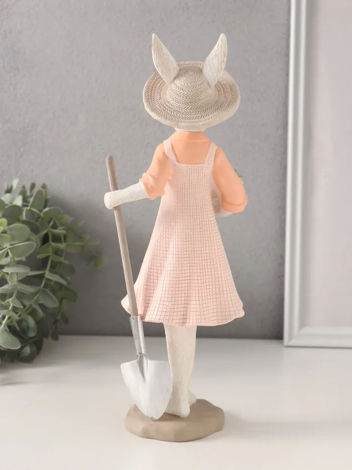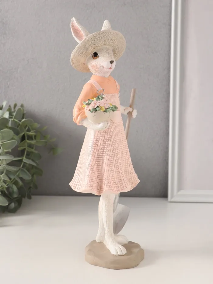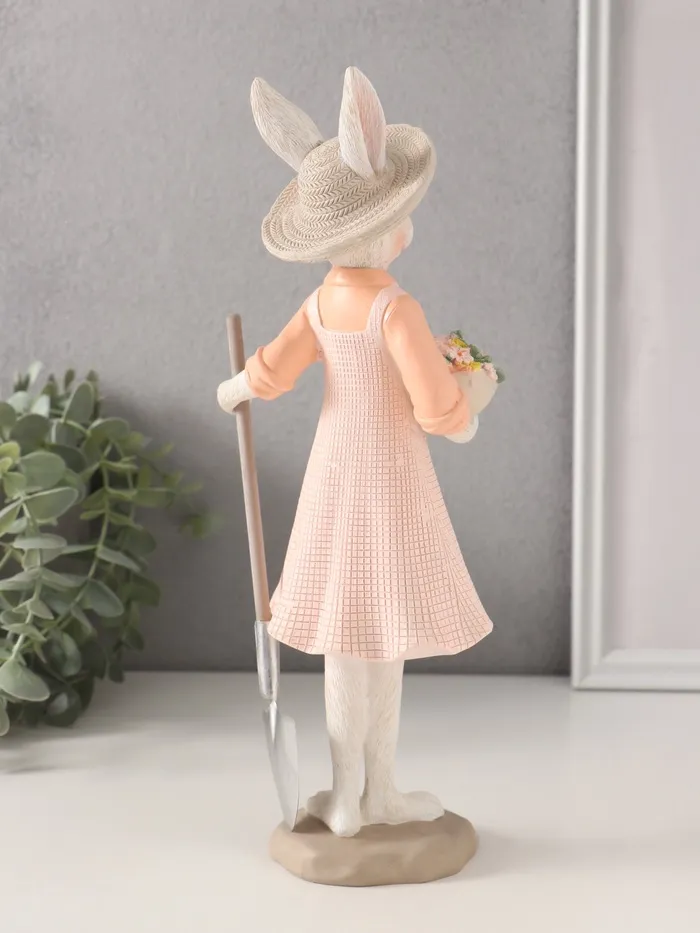 Фигурка полистоун «Зайка в сарафане и шляпке, с лопатой и цветами в горшке», 10.5×8×27.5 см — Характеристики