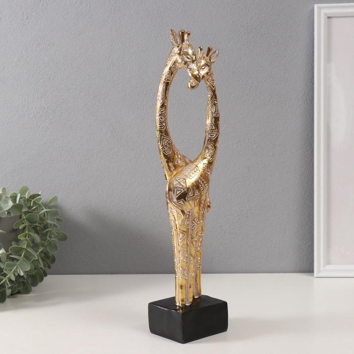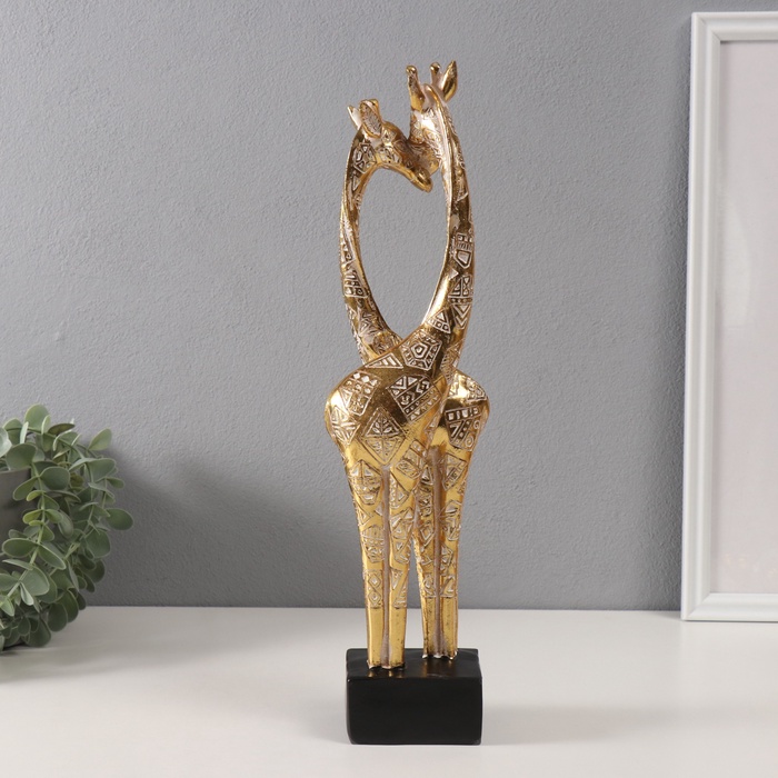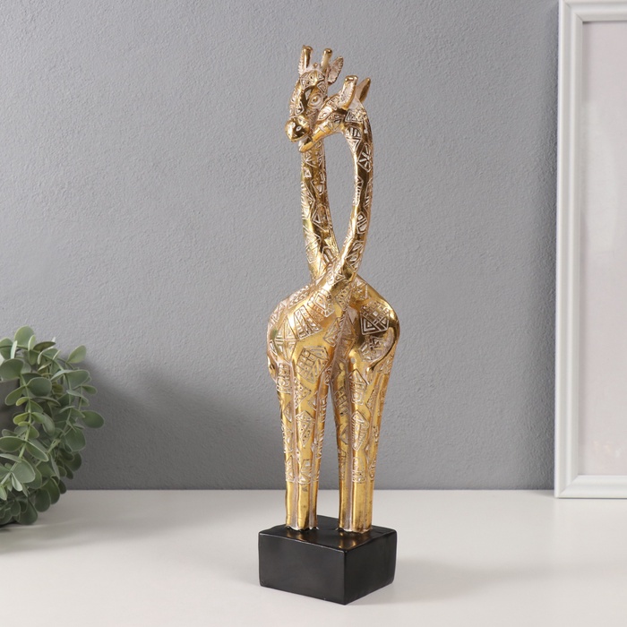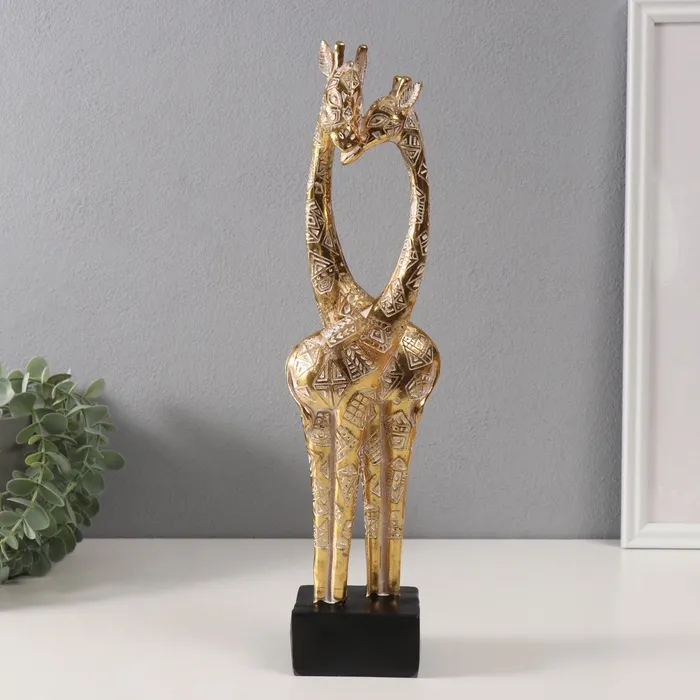 Высота 39,5 см делает её заметным элементом декора, который органично впишется в интерьер гостиной, спальни или даже свадебного торжества. Компактные размеры (10×7×39.5 см) позволяют разместить её на полке, столике или каминной зоне. Золотистый цвет подчёркивает роскошь и благородство изделия, а тематика пары жирафов делает его идеальным подарком на День святого Валентина, свадьбу или любой другой особенный случай.