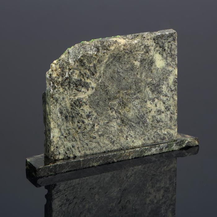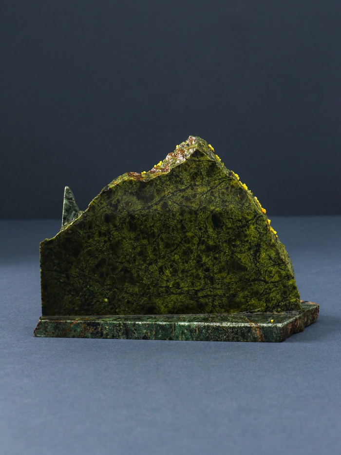 Серпентинит в народе называют змеевиком из-за схожести со змеиной кожей. Цвет минерала варьируется от тёмно- до жёлто-зелёного.