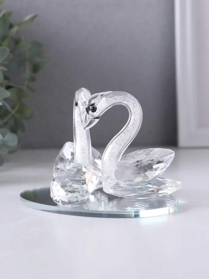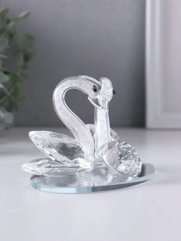 Встречайте изысканное воплощение грации и вечной любви — стеклянную композицию с лебедями, украшенную мерцающими стразами. Прозрачное великолепие материала подчёркивает чистоту линий и элегантность формы, а акцентные детали добавляют изделию особого сияния. Эти птицы, символизирующие верность и гармонию, станут идеальным дополнением для любого интерьера или подарком к особенному случаю.