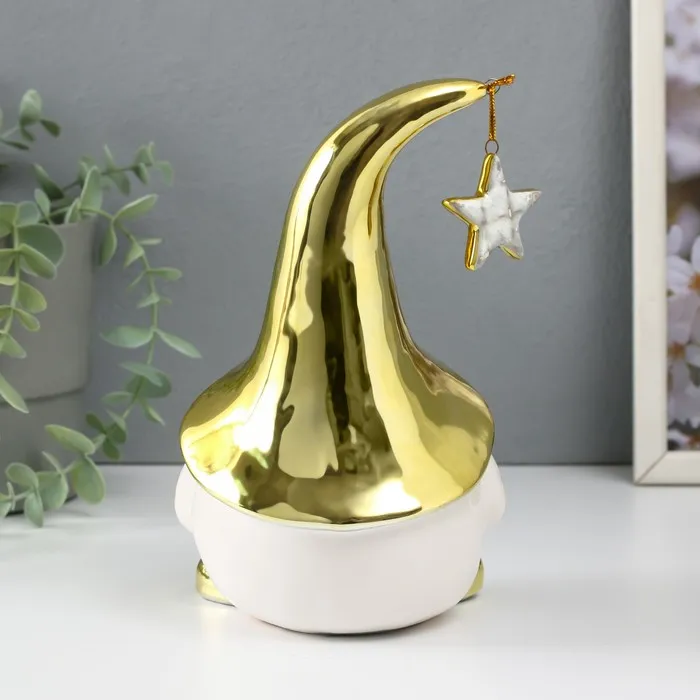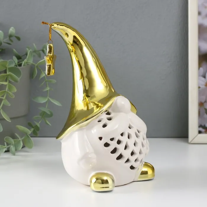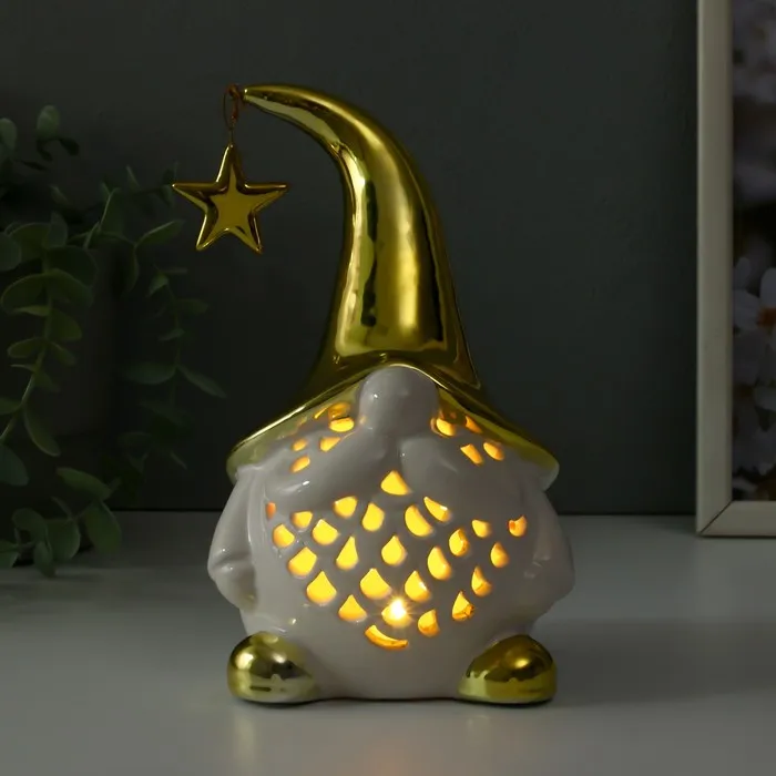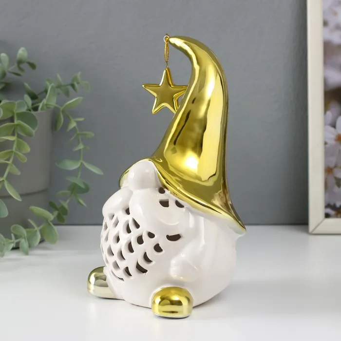 Фигурка светящаяся керамика «Гном в золотом колпаке со звездой», белый, 11.6×10.7×19.3 см — Характеристики