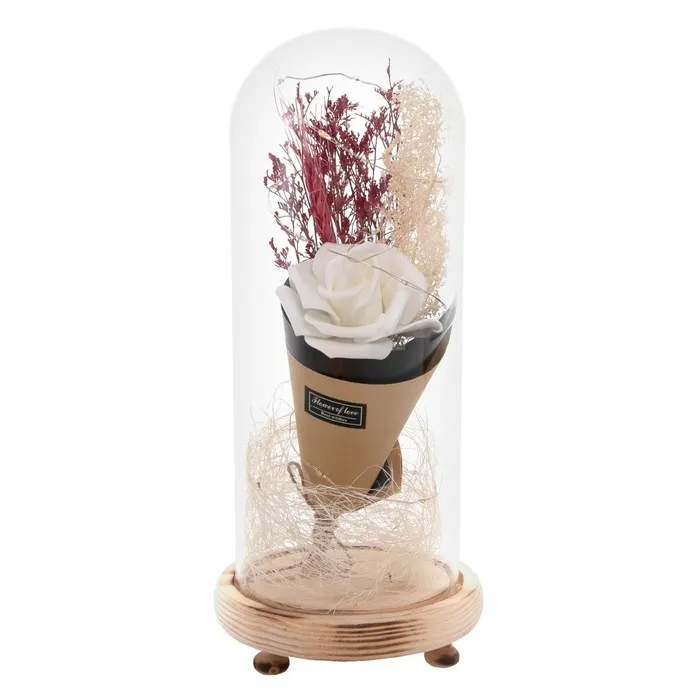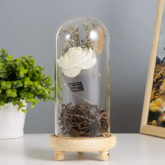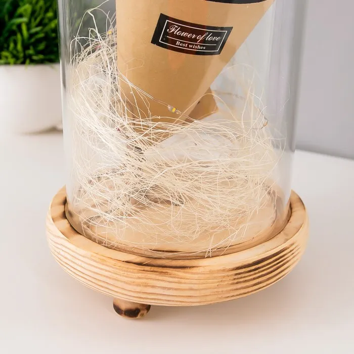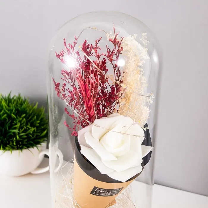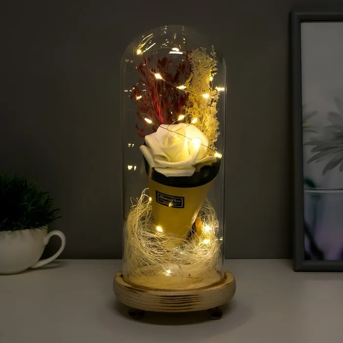 Великолепный ночник и подарок в одном аксессуаре. Этот вечный цветок не вянет и не требует особого ухода. Такие композиции часто применяют во флористике, упаковке подарков и дизайне интерьеров.