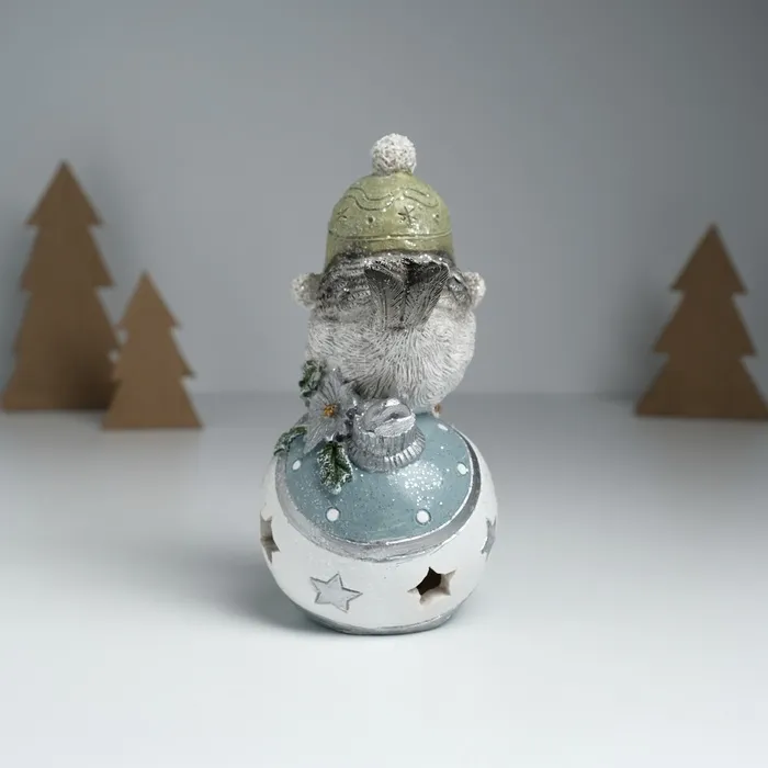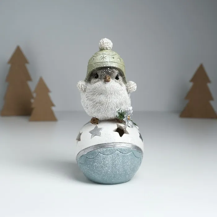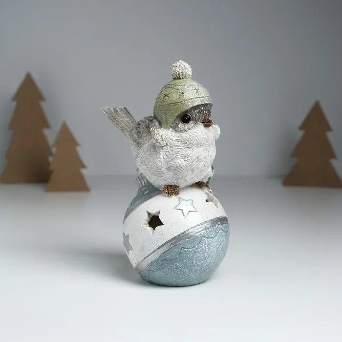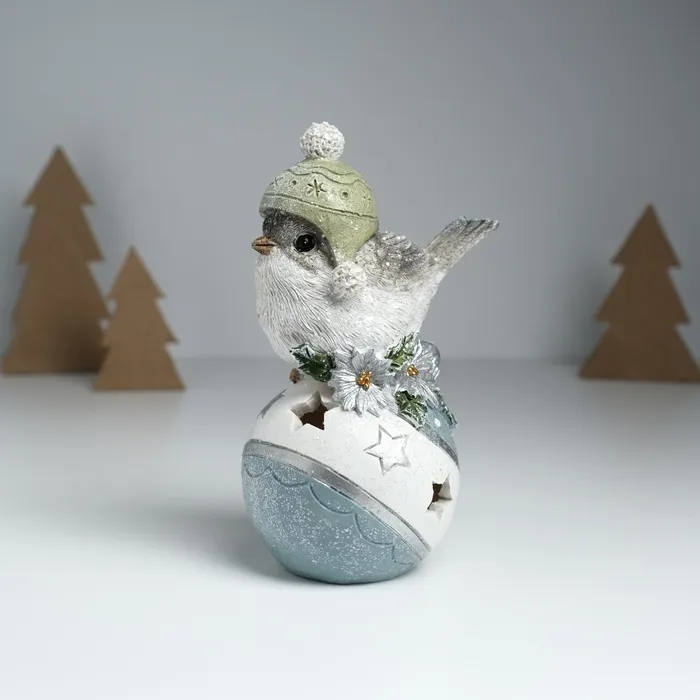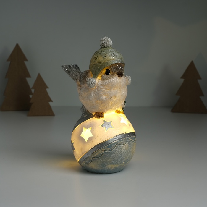 Фигурка светящаяся «Воробышек в шапке сидит на новогоднем шарике», серый, 7.6×9.5×15 см — Характеристики