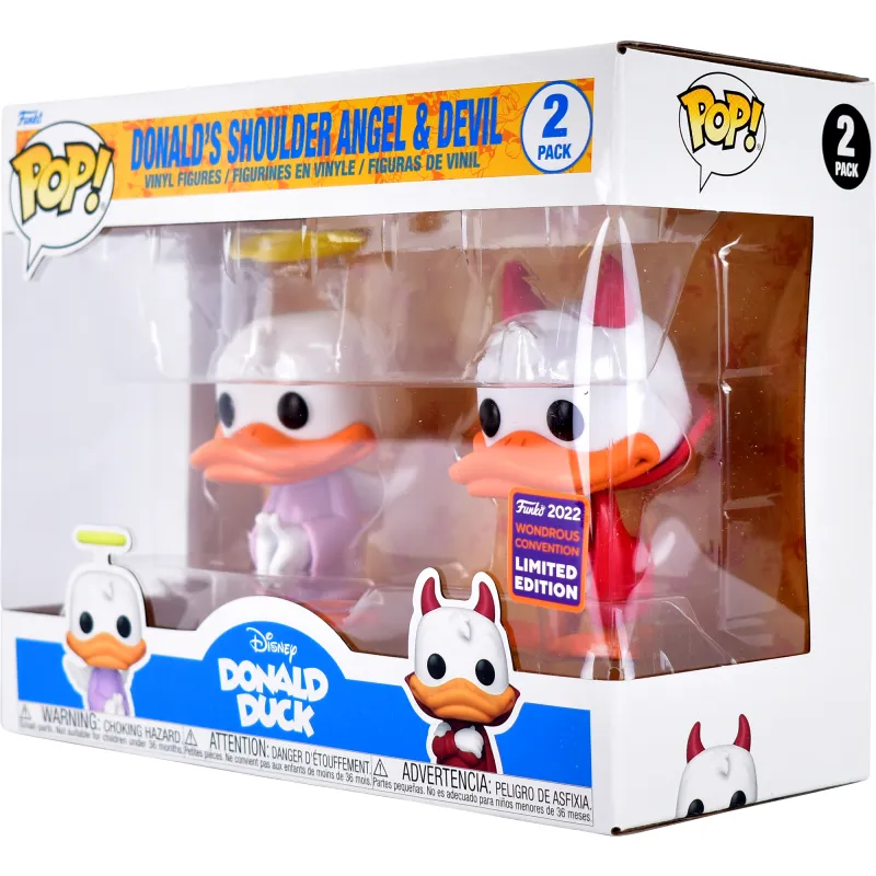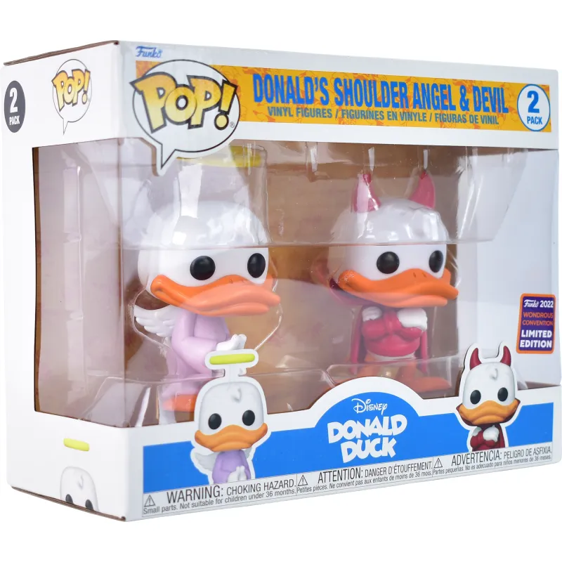 Фигурки Funko POP! – это коллекционные игрушки с большими головами, вдохновленные поп-культурой. Набор из двух фигурок Дональда Дака включает ангела и дьявола, которые влияют на его принятие решений.
