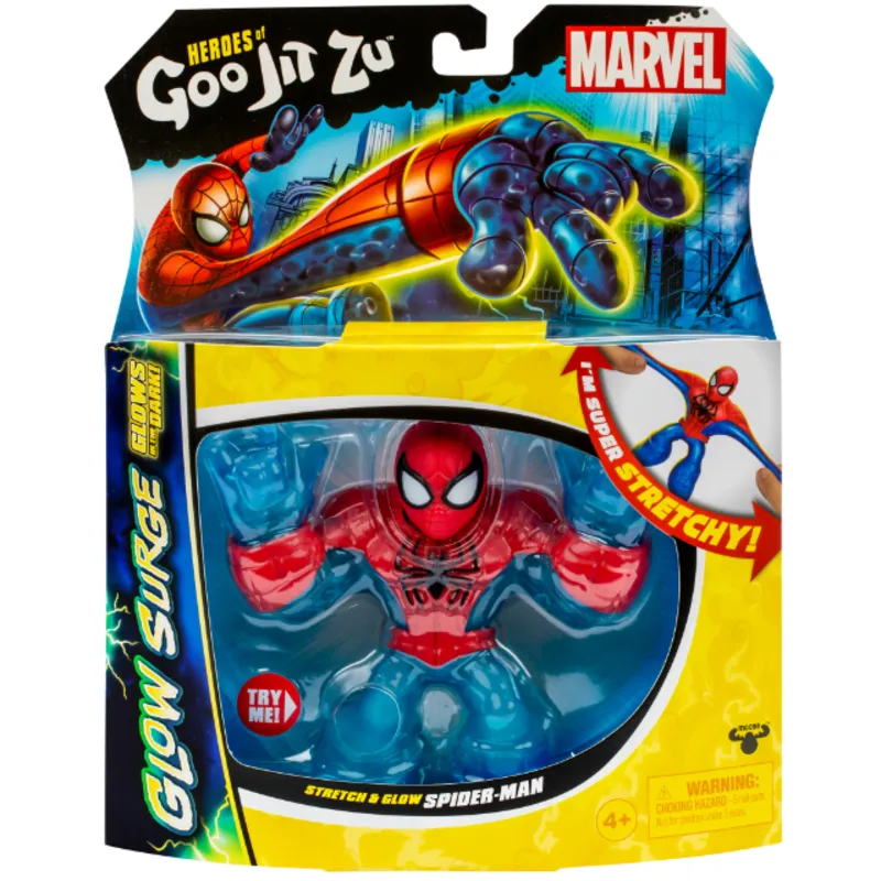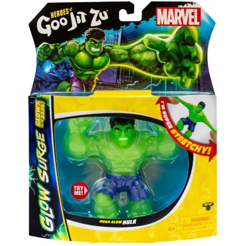 Эти невероятные супергерои светятся в темноте! Играй и сражайся всю ночь, растягивая и сжимая эти удивительные светящиеся фигурки. Фигурку можно растянуть до 3-х раз от её реального размера, и она всегда возвращается в свою первоначальную форму. Соберите всех героев Marvel, включая Stretch & Glow Spider-Man, Mega Glow Hulk и Stretch & Glow Iron Man.
