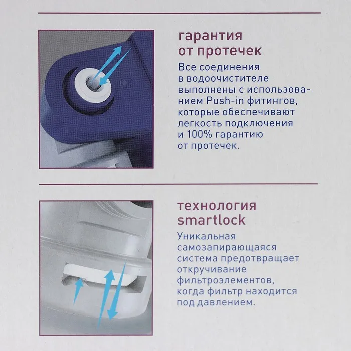 - Самозапирающееся соединение фильтров — не даёт им отсоединиться под давлением воды.