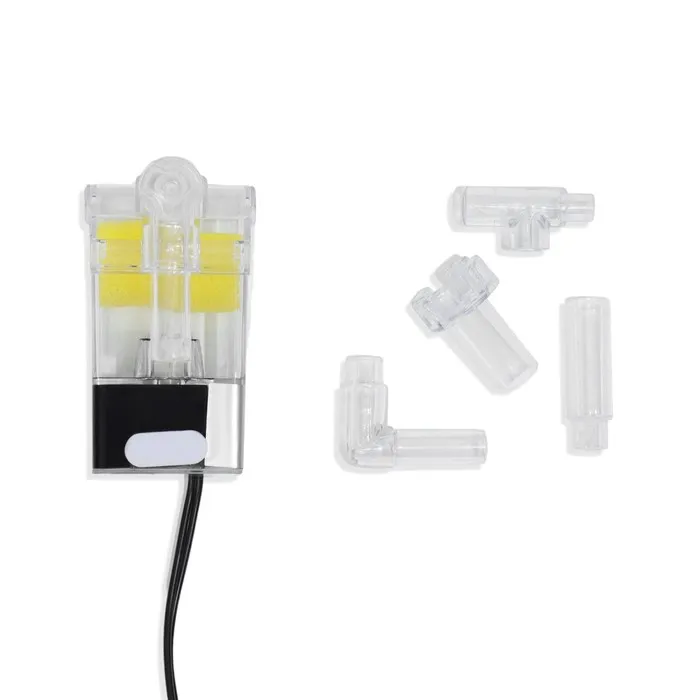 Фильтр выполнен в стильном сочетании прозрачного и чёрного цветов, что делает его практически незаметным в аквариуме, сохраняя эстетику вашего водного мира. Компактные размеры и продуманный дизайн позволяют легко установить его даже в небольших аквариумах, обеспечивая комфорт и безопасность для их обитателей.