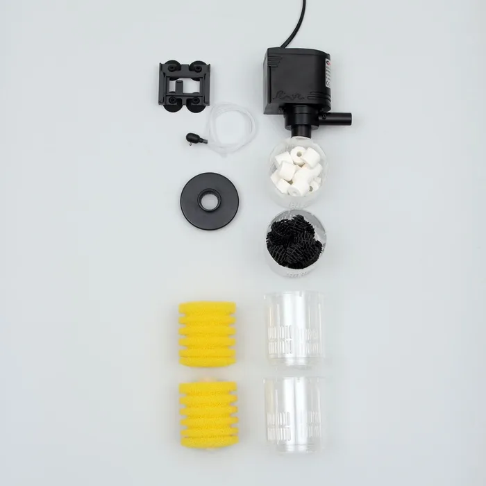 Он оснащен четырьмя секциями для очистки воды: губками, биошариками и керамическими кольцами.