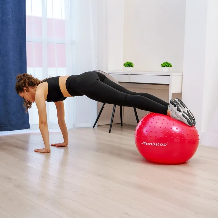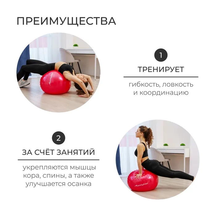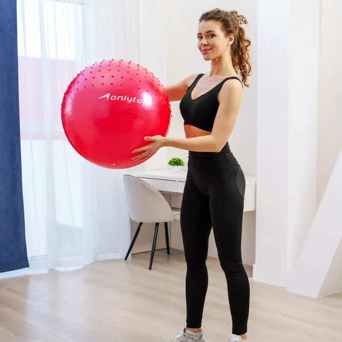 Поверхность мяча выполнена из противоскользящего материала, что позволяет сосредоточиться на выполнении упражнений без риска.
