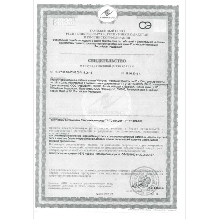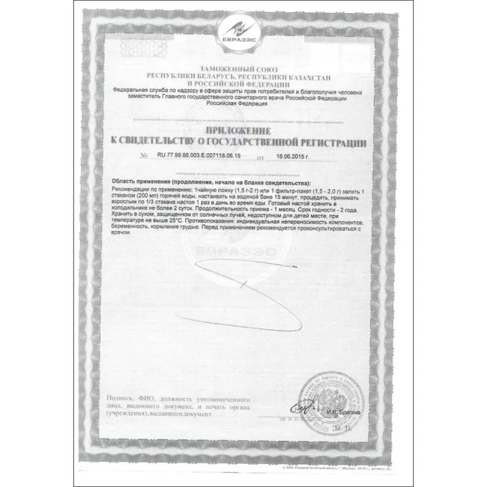 Способ применения: 1 чайную ложку (1,5 -2,0 г) или 1 фильтр-пакет (1,5 г или 2,0 г) залить 1 стаканом (200 мл) горячей воды, настоять на водяной бане 15 минут, процедить, принимать взрослым по 1/3 стакана 1 раз в день во время еды. Готовый настой хранить в холодильнике не более 2-х суток. Продолжительность приёма – 1 месяц.