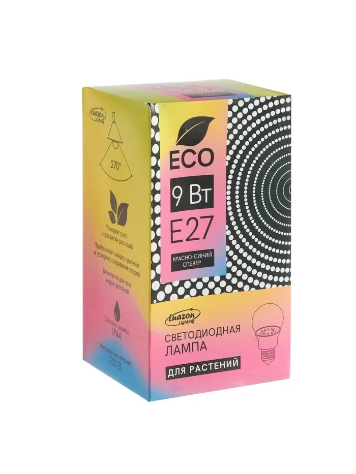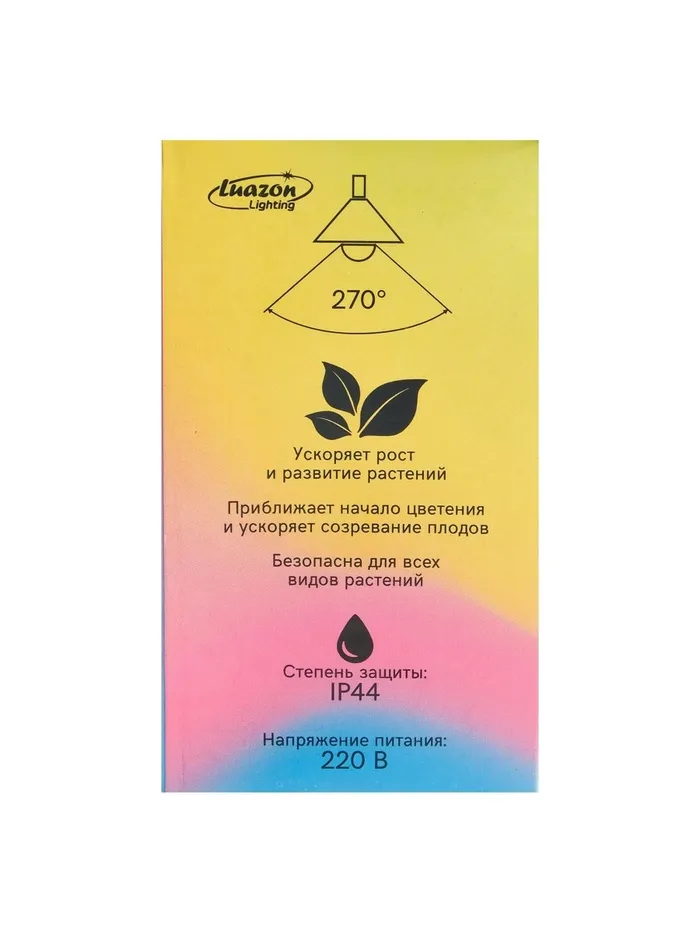 Фитолампа для растений Luazon Lighting, светодиодная, А60, E27, 9 Вт, IP44, 220 В, 270°, мультиспектральная — Характеристики