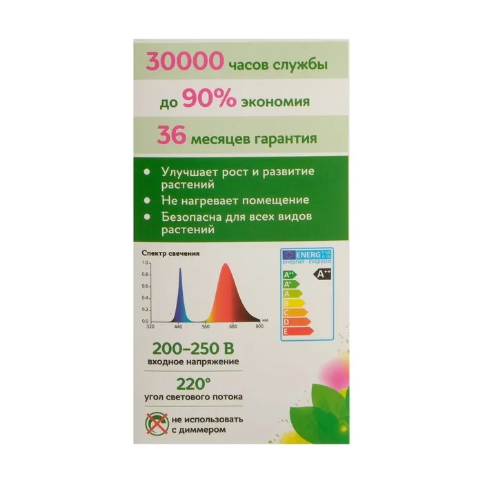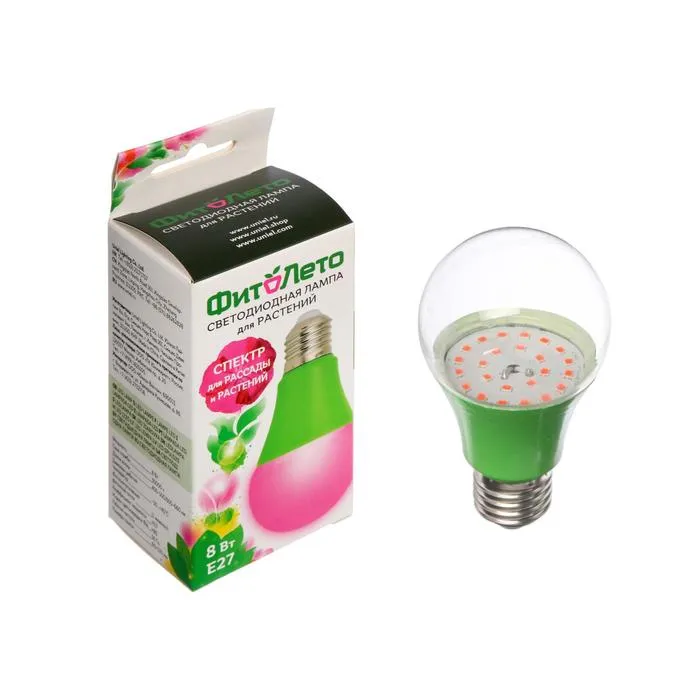 Фитолампа для растений Uniel, светодиодная, А60, 8 Вт, Е27, 250 В, 220°, мультиспектральная — Характеристики