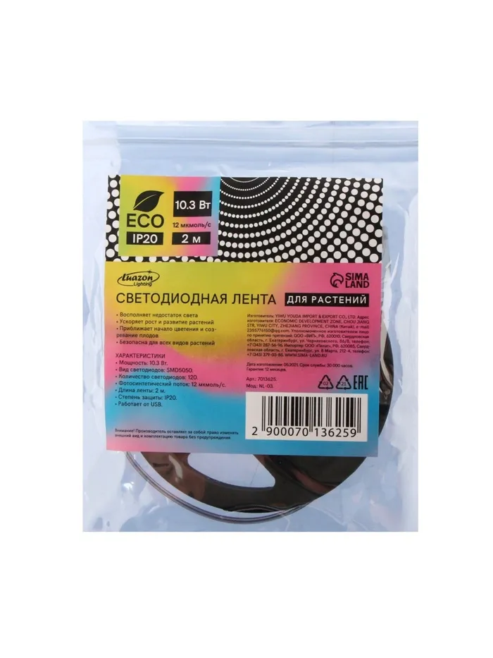 Фитолента для растений Luazon Lighting, светодиодная, 10.3 Вт, 2 м, IP20, 5 В, 60 LED/м, USB, SMD5050, мультиспектральная — Характеристики