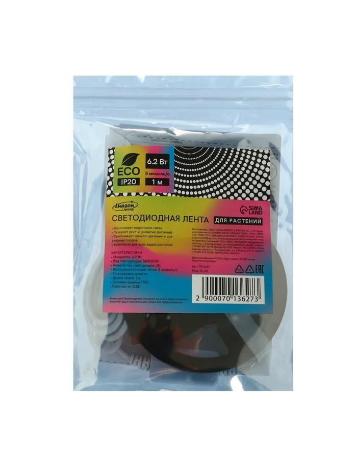 Фитолента для растений Luazon Lighting, светодиодная, 6.2 Вт, 1 м, IP20, 5 В, 60 LED/м, диммер, USB, SMD5050, мультиспектральная — Характеристики