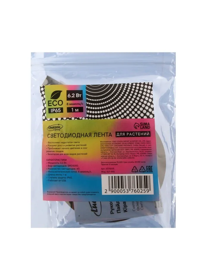 Фитолента для растений Luazon Lighting, светодиодная, 6.2 Вт, 1 м, IP65, 5 В, 60 LED/м, USB, SMD5050, мультиспектральная — Характеристики