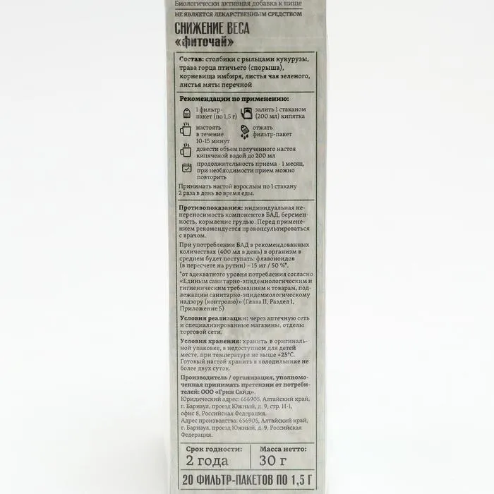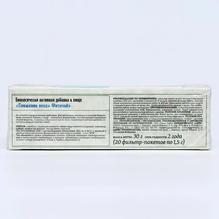 Назначение: рекомендуется в качестве биологически активной добавки к пище – источника флавоноидов, способствующей улучшению обмена веществ, снижению избыточной массы тела, помогающей контролировать аппетит и снизить чувство голода.