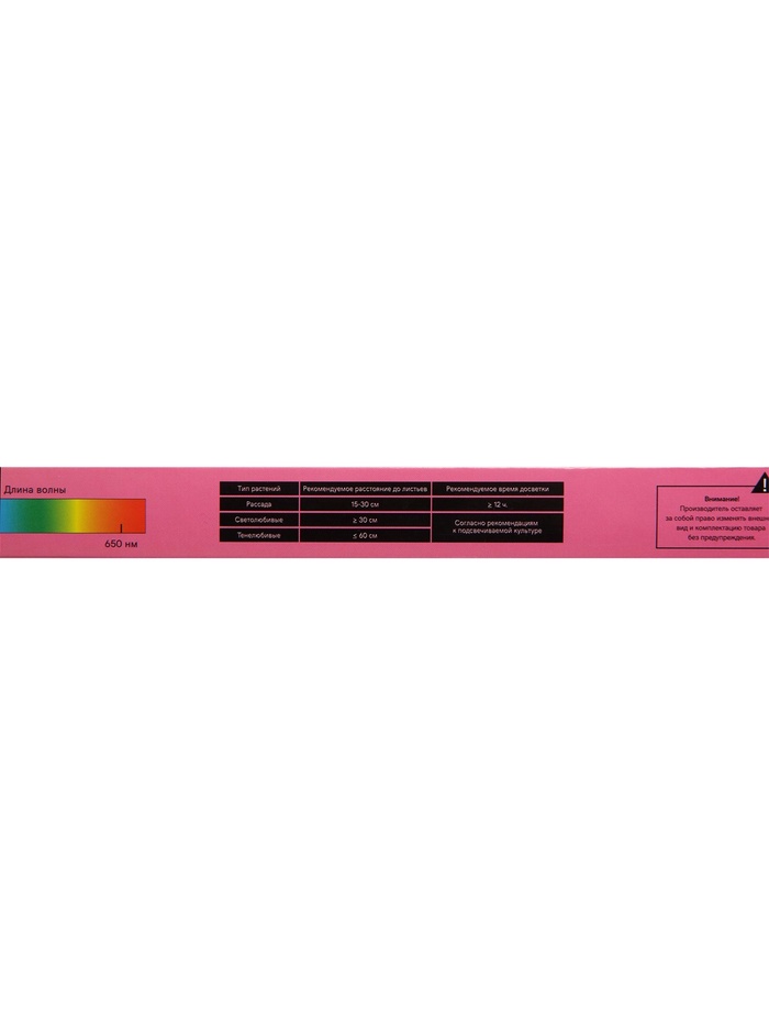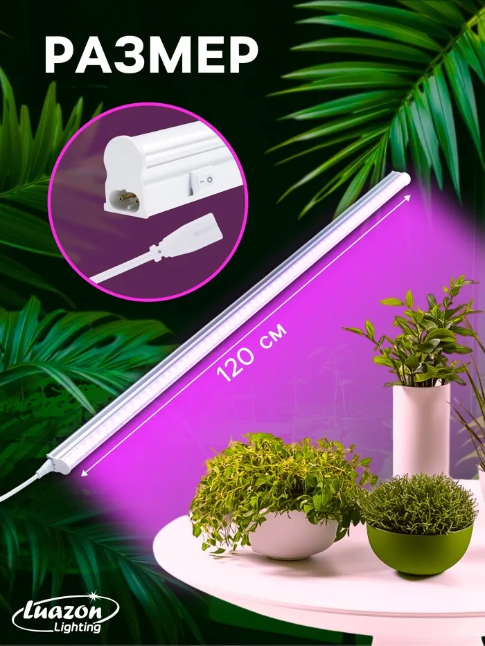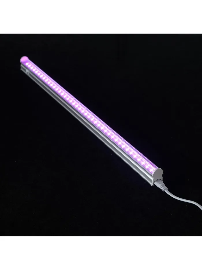 Светильник мощностью 18 Вт и длиной 1200 мм излучает излучает мультиспектральный свет с преобладанием розового оттенка, который оптимально подходит для стимулирования фотосинтеза и активного роста растений. а прозрачный рассеиватель мягко распределяет свет, не создавая дискомфорта для глаз. Угол рассеивания 120° позволяет охватить большую площадь, что делает устройство универсальным для использования в домашних оранжереях, на подоконниках или в небольших теплицах.