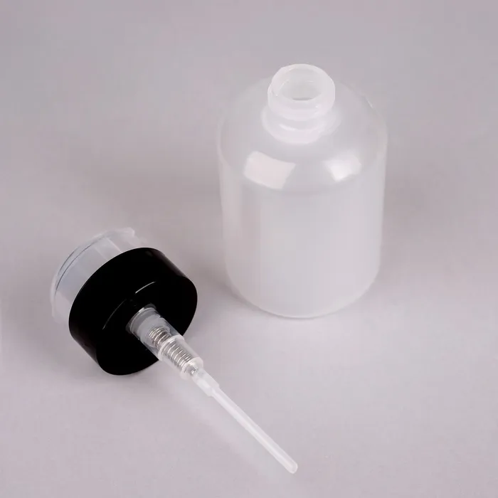 Изготовленный из прочного и лёгкого пластика, флакон обладает двумя контрастными цветами — чёрным и прозрачным, что позволяет вам легко контролировать уровень содержимого. А помпа обеспечивает удобное и точное дозирование, что особенно важно для сохранения гигиеничности и экономии вашего любимого средства.