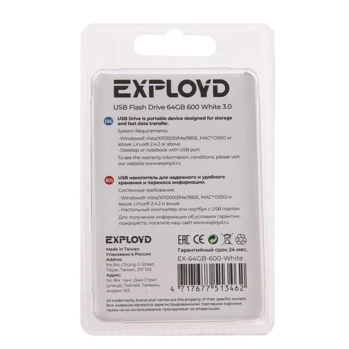 Флешка Exployd 600, 64 Гб, USB3.0, чт до 70 Мб/с, зап до 20 Мб/с, белая — Характеристики