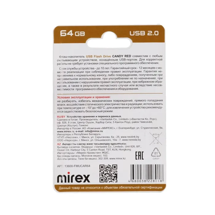 Флешка Mirex CANDY RED, 64 Гб ,USB2.0, чт до 25 Мб/с, зап до 15 Мб/с, красная — Характеристики