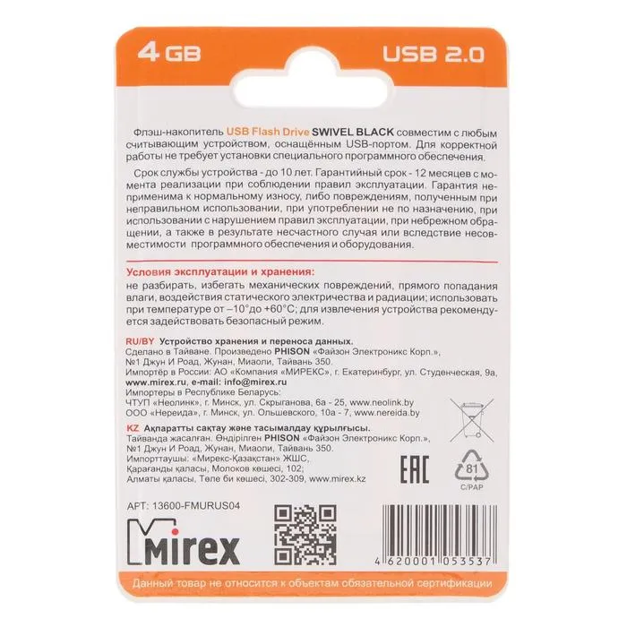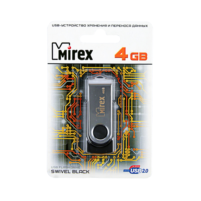 Флешка Mirex SWIVEL BLACK, 4 Гб, USB2.0, чт до 25 Мб/с, зап до 15 Мб/с, черная — Характеристики