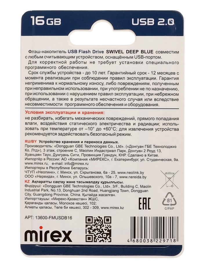Флешка Mirex SWIVEL DEEP BLUE, 16 ГБ (Ecopack) — Характеристики