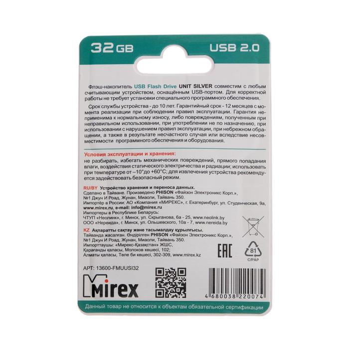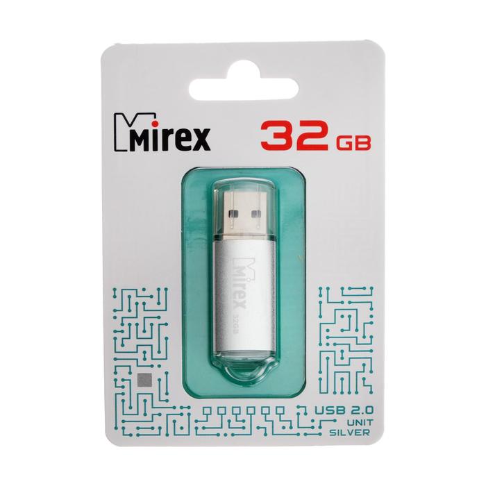 Флешка Mirex UNIT SILVER, 32 ГБ, USB 2.0, чтение до 25 Мб/с, запись до 15 Мб/с, серебристая — Характеристики