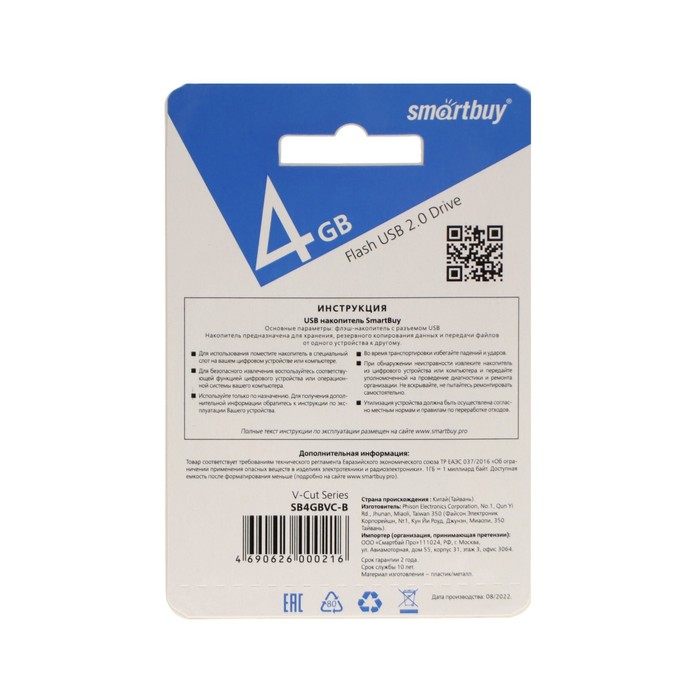 Флешка Smartbuy V-Cut, 4 Гб, USB 2.0, чт до 25 Мб/с, зап до 15 Мб/с, синяя — Характеристики