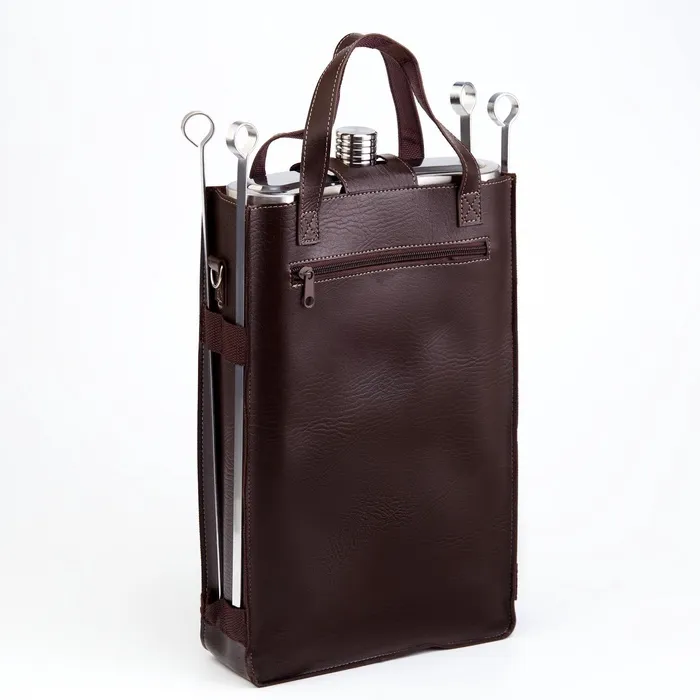 Комплектация включает в себя удобный чехол, который защищает фляжку от внешних воздействий и помогает сохранить её первоначальный внешний вид и 4 шампура длиной 40 см.