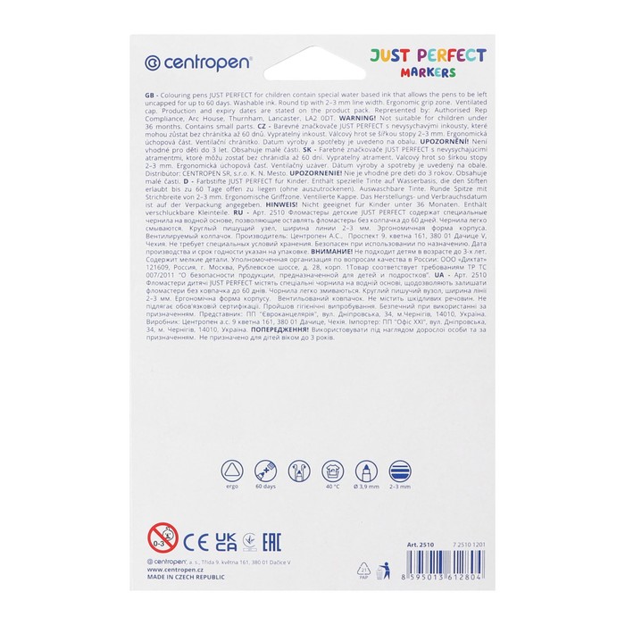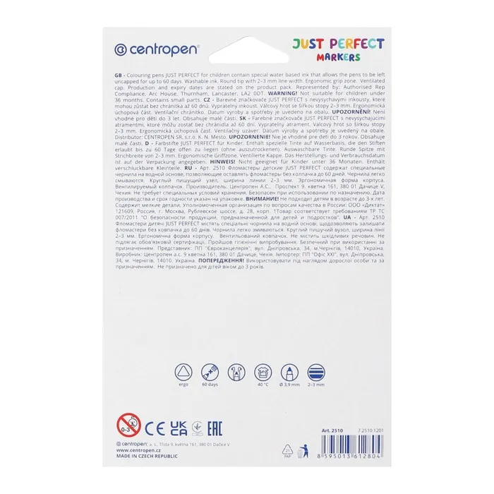 Фломастеры 12 цветов Centropen 2510 Perfect, 3.9 мм невысыхаемые, картонная упаковка, европодвес — Характеристики