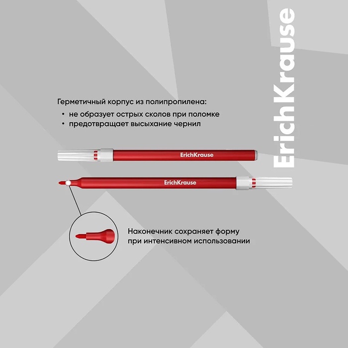 - Герметичный корпус из полипропилена не образует острых сколов при поломке и предотвращает высыхание чернил.