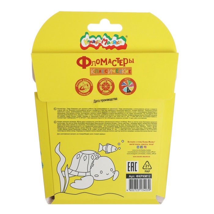 Фломастеры 12 цветов «Каляка-Маляка», классические, легкосмываемые, круглый корпус ФКРКМ12 — Характеристики