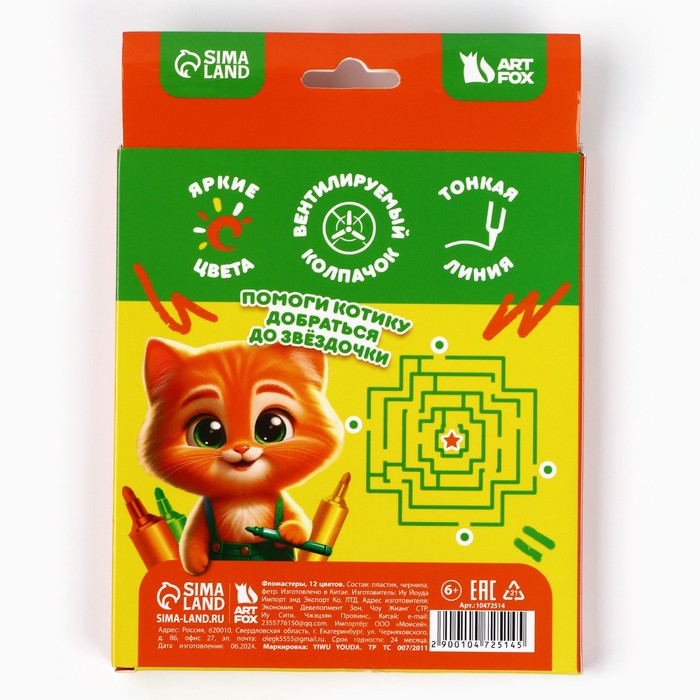 Фломастеры 12 цветов, вентилируемый колпачок, «Кот» — Характеристики