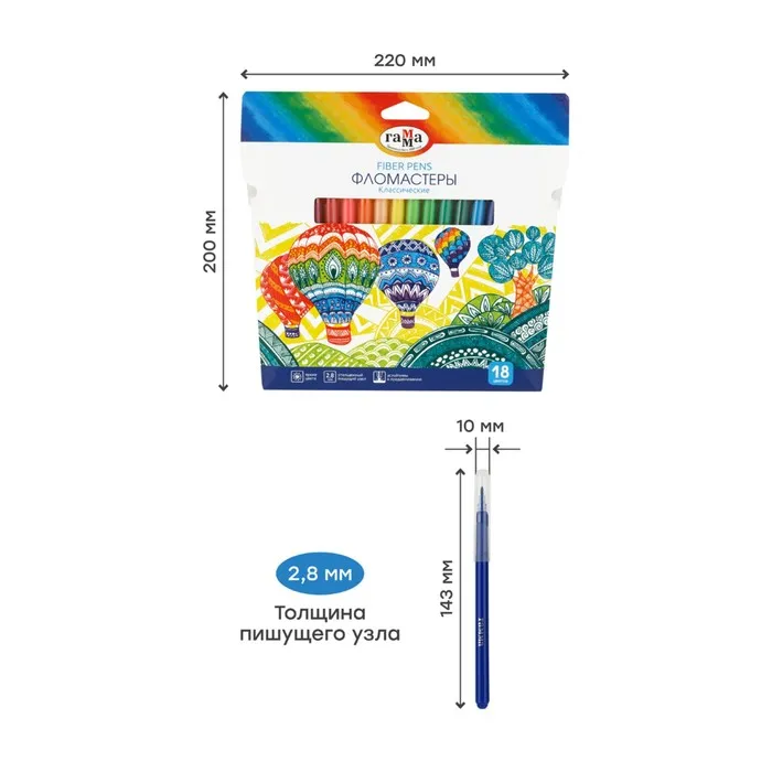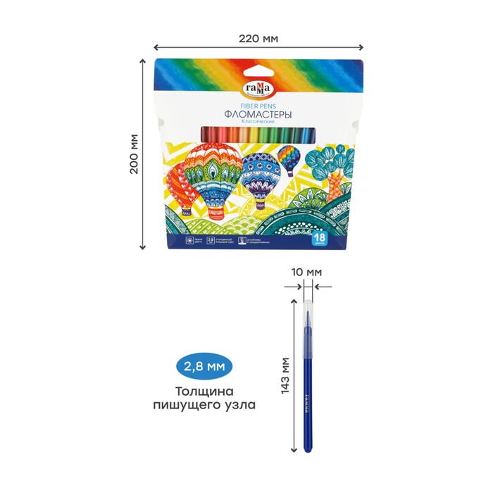 Фломастеры ГАММА серии «Классические» отлично подойдут для детского творчества. В наборе 18 насыщенных цветов. Чернила на основе воды и пищевых красителей легко смываются с одежды и рук и избавят от хлопот после рисования. Колпачок фломастера вентилируемый, что поможет избежать негативных сценариев при проглатывании его ребенком. Корпус круглой формы диаметром 10 мм изготовлен из безопасного полипропилена и имеет удобную круглую зону захвата. Тип наконечника – конический. Толщина пишущего узла – 2,8 мм позволяет наносить как тонкие, так и толстые линии для создания ярких рисунков. Набор фломастеров упакован в красочную картонную упаковку-конверт с европодвесом, которая может вдохновить ребёнка на творчество. Продукция морозоустойчива.
