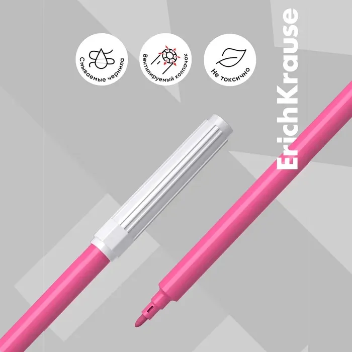 Фломастеры ErichKrause со смываемыми чернилами на водной основе. Идеально подходят как для рисования, так и для раскрашивания. Широкая палитра ярких цветов. Наконечник сохраняет форму при интенсивном использовании. Чернила на водной основе не имеют запаха, отстирываются с большинства тканей и поверхностей. Герметичный корпус из полипропилена не образует острых сколов при поломке и предотвращает высыхание чернил.