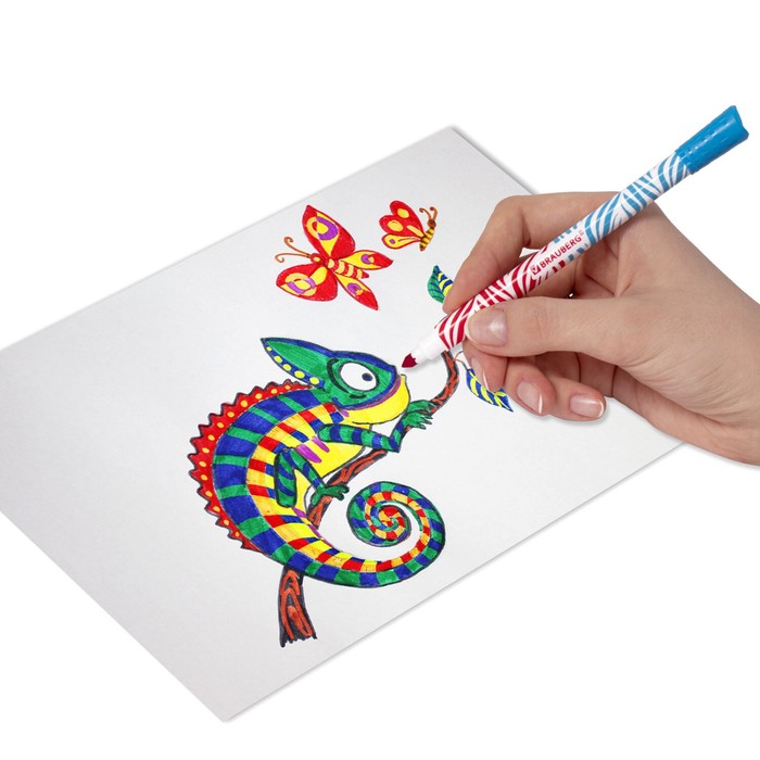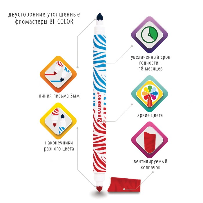 Фломастеры имеют удобную круглую форму корпуса, длина которого 160 мм, а диаметр составляет 9,8 мм. Процесс раскрашивания становится приятным и увлекательным благодаря разноцветному двустороннему наконечнику с линией письма 1-3 мм и диаметром пишущего узла 4,6 мм. Фломастеры изготовлены на водной основе, поэтому практически не имеют запаха, не токсичны и легко смываются с большинства материалов и тканей. Фломастеры обладают экономным расходом чернил, при этом длина линии письма достигает 500 метров. Быстросохнущие чернила предотвращают смазывание рисунка. Благодаря полипропиленовому корпусу срок службы фломастеров значительно увеличивается, а вентилируемый колпачок не причинит вреда при попадании в дыхательные пути. Рекомендованы для детей от 3-х лет.