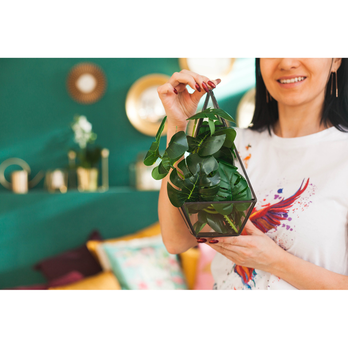 Флорариум заменяет традиционные вазы — он интереснее смотрится и требует меньше ухода. Наполните его песком, камнями и засухоустойчивыми растениями, чтобы создать долговечную композицию. Черный каркас подчеркивает зелень и добавляет контраста.