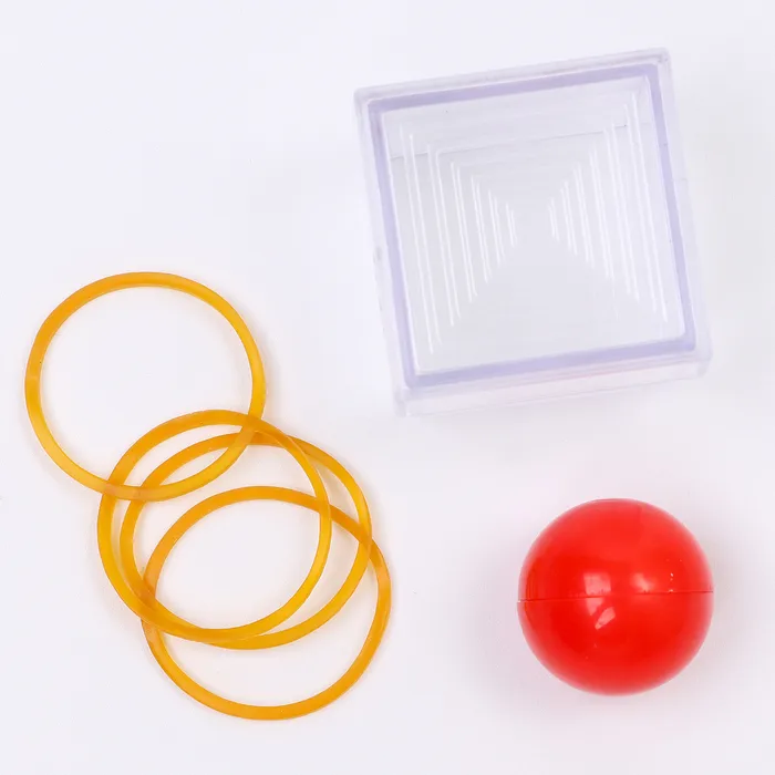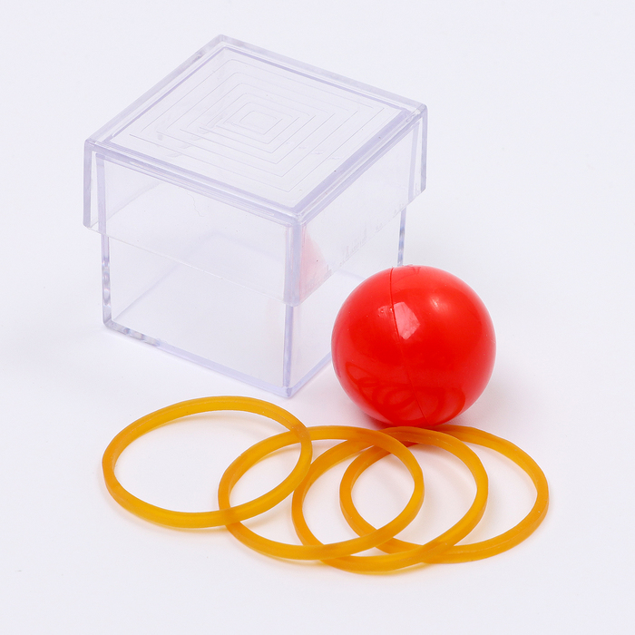 Положи прозрачную коробочку и маленький шарик на стол, попроси зрителей осмотреть их. После того как зрители убедятся, что всё в порядке, накрой коробку крышкой. Положи крышку на закрытую сторону коробки. Затем крест-накрест обвяжи коробку резинками, постучи по шести сторонам коробки шариком и скажи зрителям, что коробка запечатана и мяч не может в неё попасть. Когда будешь стучать по открытой стороне, стучи по краю крышки. Затем с силой ударь открытой стороной коробки по шару, и он войдёт внутрь. Сразу сними резинки и крышку, а затем выкати шар, чтобы зрители не обнаружили, что крышка была на открытой стороне.