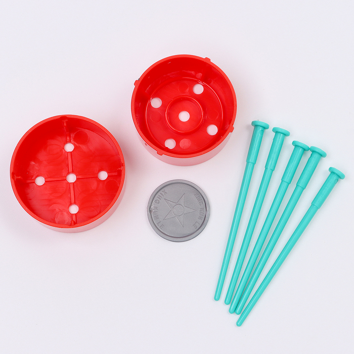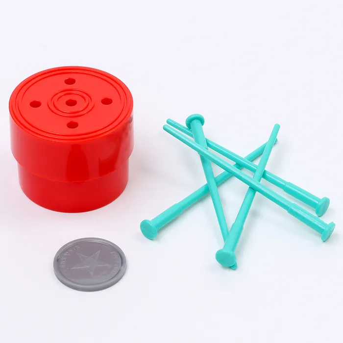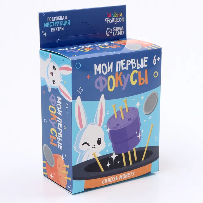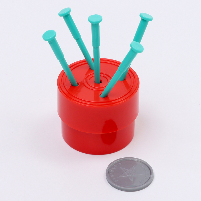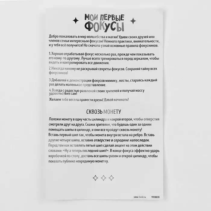 Положи монету в одну часть цилиндра и накрой второй, чтобы отверстия смотрели друг на друга. Скажи зрителям, что будешь один за одним помещать шипы в цилиндр, и они все пройдут сквозь монету! Вставь первый шип так, чтобы монета внутри встала на ребро. Вставь другие четыре шипа, оставив отверстие в середине напоследок. Перед тем как вставлять пятый шип —сделай акцент на этом действии словами: «Ну а теперь последний шип!». В конце фокуса эффектно ударь коробочкой по столу, достань все шипы разом и открой цилиндр, чтобы показать публике невредимую монетку.