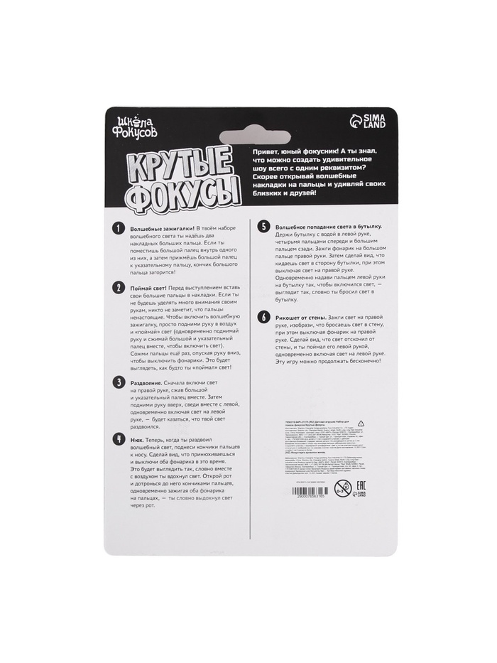 - Фокус «Волшебные зажигалки»: возьмите из набора два накладных больших пальца и поместите один из пальцев внутрь накладного, а затем прижмите большой палец к указательному — кончик искусственного пальца загорится!