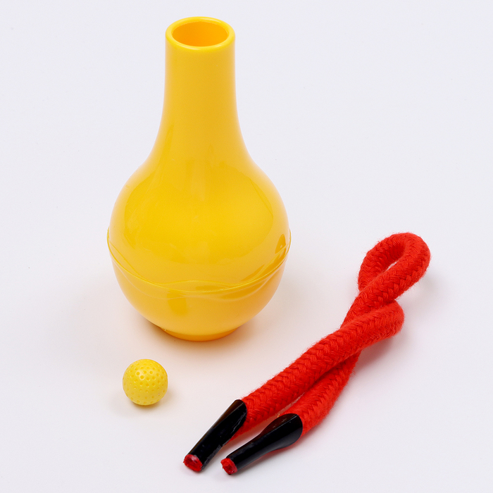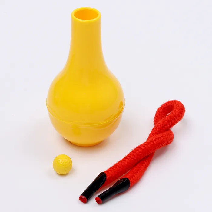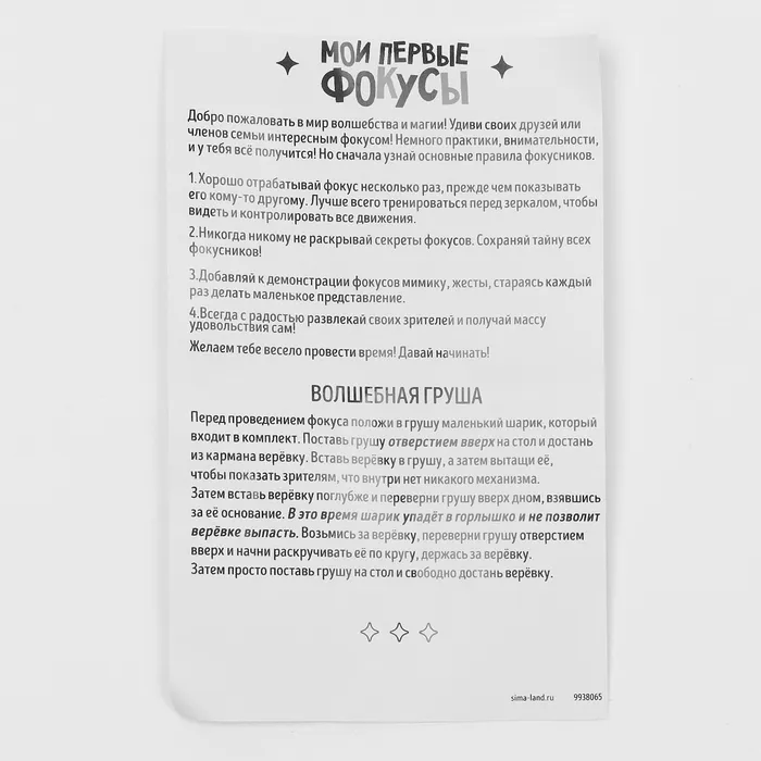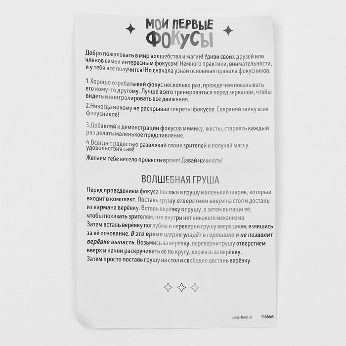 Перед проведением фокуса незаметно положи в грушу маленький шарик, который входит в комплект. Поставь грушу на стол отверстием вверх, достань из кармана верёвку. Вставь верёвку в грушу, а затем вытащи её, чтобы показать зрителям, что внутри нет никакого механизма. Затем вставь верёвку поглубже и переверни грушу вверх дном, взявшись за её основание. В это время шарик упадёт в горлышко и не позволит верёвке выпасть. Возьмись за верёвку, переверни грушу отверстием вверх и начни раскручивать её по кругу, держась за верёвку. Затем просто поставь грушу на стол и свободно достань верёвку.